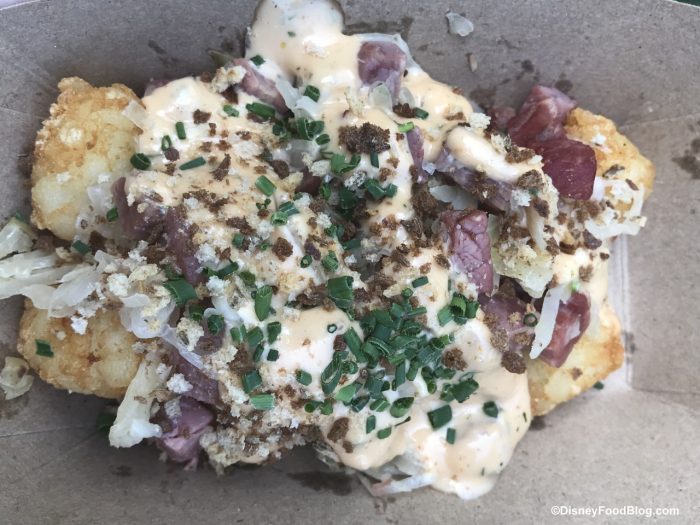 The Reuben Potato Bites dish is a returning item from 2019, and we were SO happy to see it was back at the festival this year. This dish is made of tater tots topped with Russian dressing, corned beef, and rye toast crumbles.