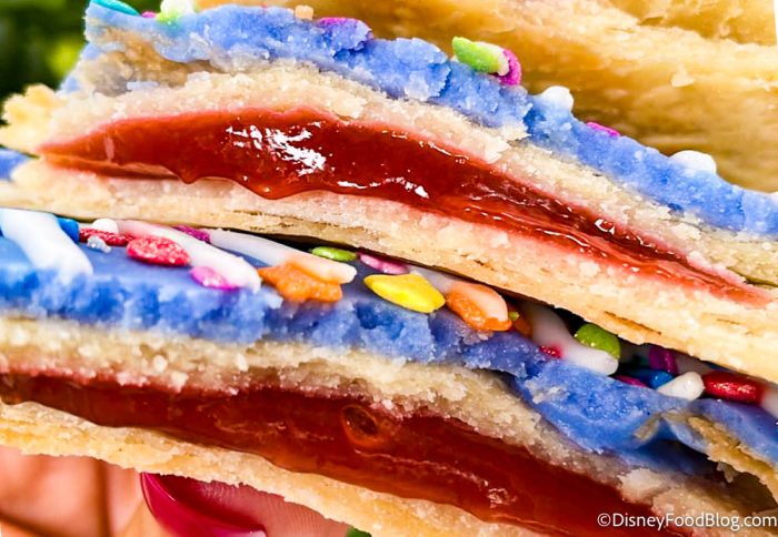 The tart is a normal pie crust that is filled with guava jelly. The whole thing is covered in blue EARidescent icing (vanilla-flavored), drizzled with white icing, and topped with colorful, glittery sprinkles. You can get one for $6.49.