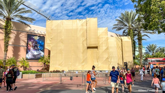 The front of Rock ‘n’ Roller Coaster has looked pretty different since September when Disney first started putting up a huge construction tarp to cover the guitar icon outside of the attraction. And, for the past few months, the big red guitar has been a big brown tarp.