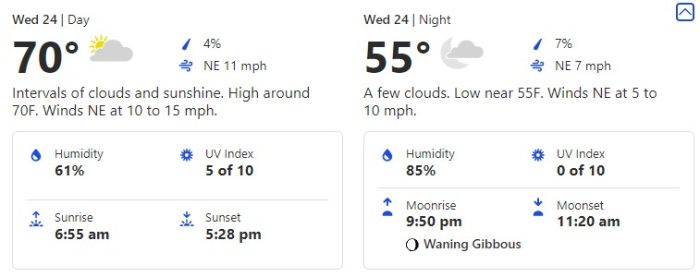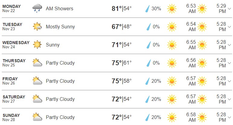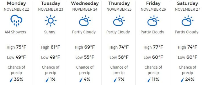 On Wednesday, November 24th, we’re going to see temps jump up just a little bit. So, we’ll be seeing low-70s heat at the hottest part of the day. Your low is gonna hang out at 55 degrees.
