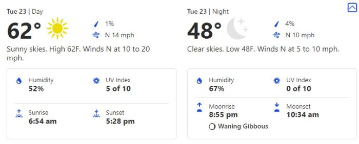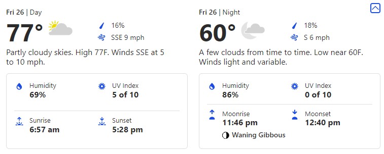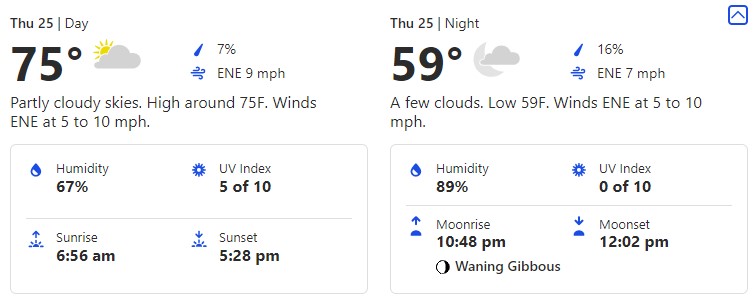 For Thursday, November 25th, we’re seeing a day with another little slide up in temperatures in the mid-70s and an evening at 59 degrees.