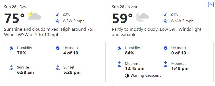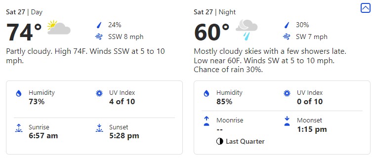 Saturday, November 27th brings us pretty similar temperatures to the day before. Here, we’ll see a 74-degree high and a 60-degree low.