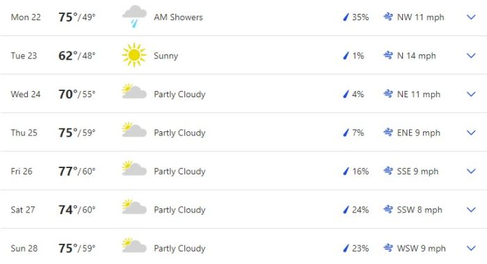 Here is a full overview of the week according to The Weather Channel. Temperatures are projected to fluctuate over the course of the week. We’re looking at a range of low-60s to high-70s highs and high-40s to low-60s lows.