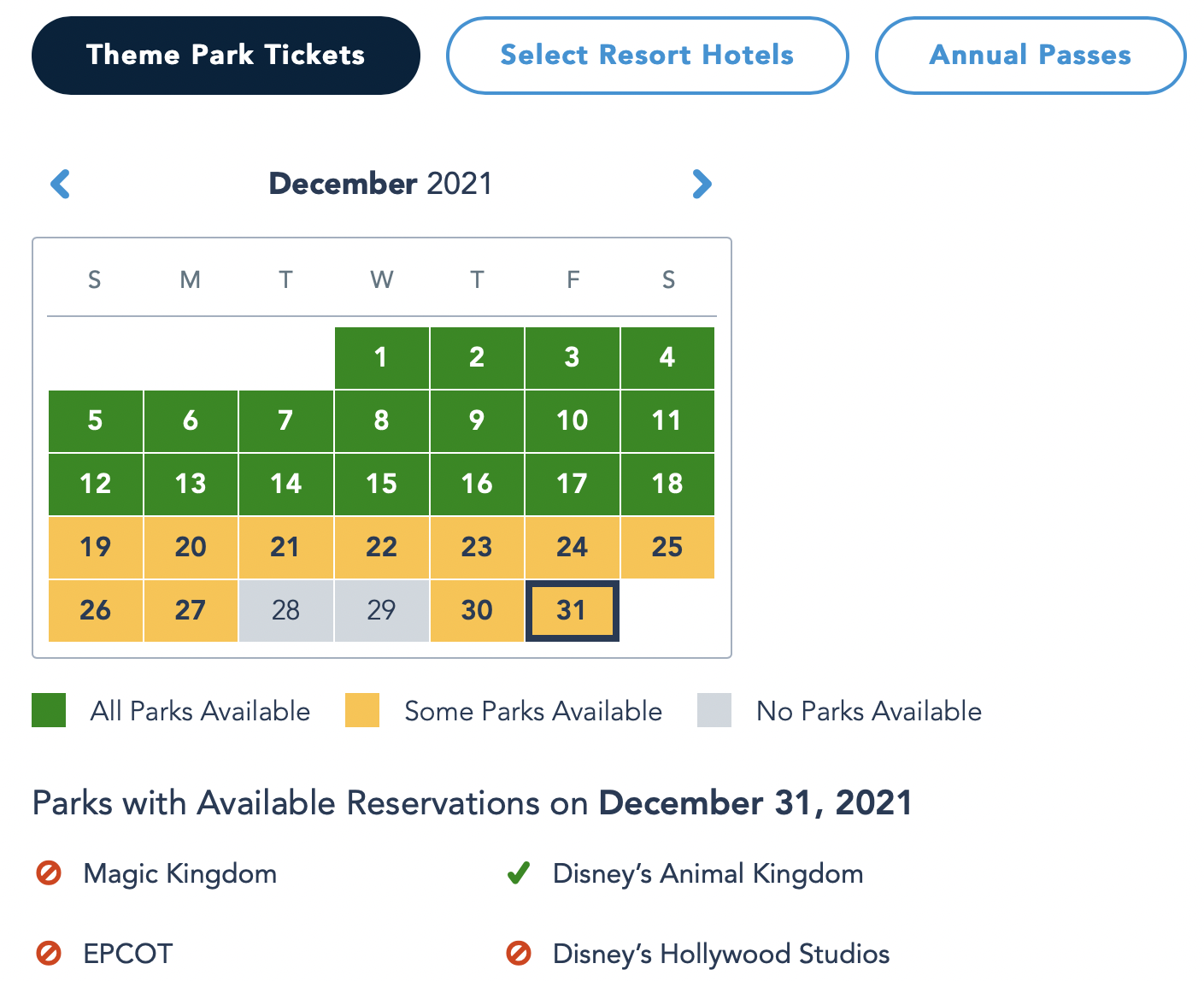 New Year’s Eve is a super crowded time at Disney World usually. And, it looks like this year will see crowds as well, because park pass reservations are currently booked for every park except Animal Kingdom.