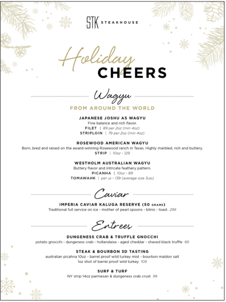 STK Orlando at Disney Springs is also doing something special for New Year’s Eve! There will be a live DJ throughout the night and a champagne toast at midnight. They will have their regular a la carte menu available, but they will also have some New Year’s Eve specials like Wagyu from around the world and a caviar presentation. You can make reservations over the phone or online here. Take a look at the special menu below!