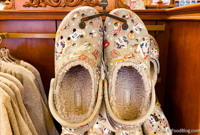 What do we mean? Well, for starters, they’re shearling-lined, which means they’ll be keeping your footsies warm all winter long, no socks required! (Unless, of course, the socks and Crocs look is your jam.) On top of that, the pattern is the perfect combination of Disney and snacks, two things that we’re big fans of here at DFB. All over the shoes is a print of Mickey and his friends made to look like cups of hot cocoa with Disney-themed holiday cookies in between.