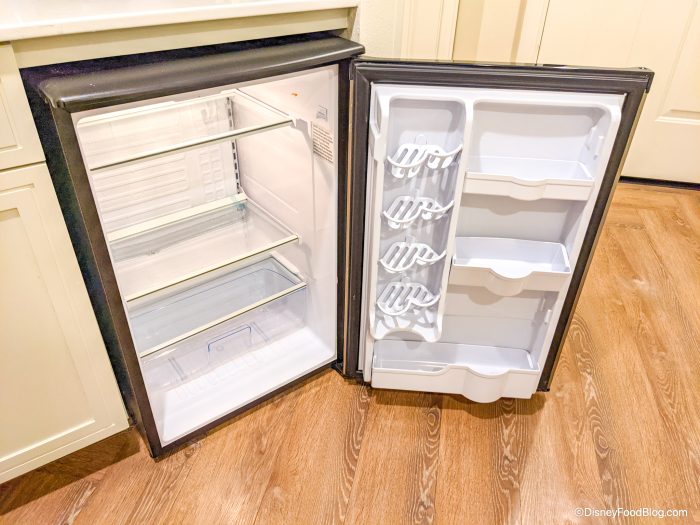 First, there’s a mini-fridge with a good amount of room for all your leftovers and snacks!