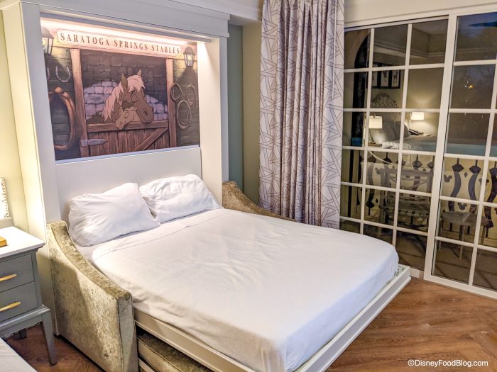 The Murphy bed, when pulled down, features an adorable artistic rendering of the Saratoga Springs Stables and plenty of room for sleeping.