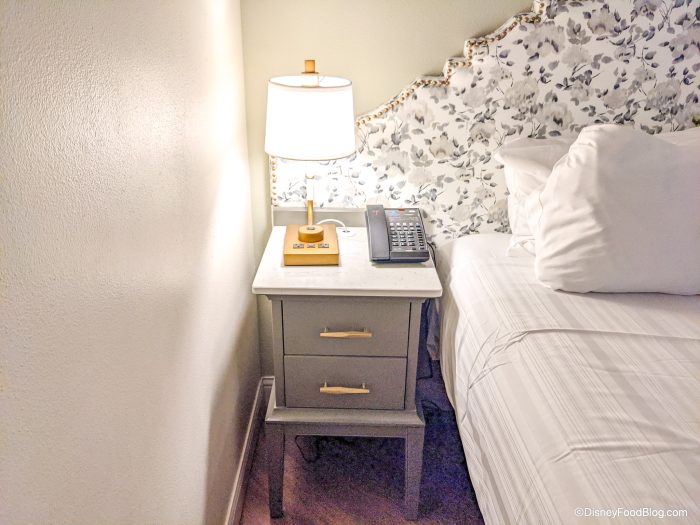 Next to the bed, there’s a nightstand with a lamp (which has two outlets) and a phone.