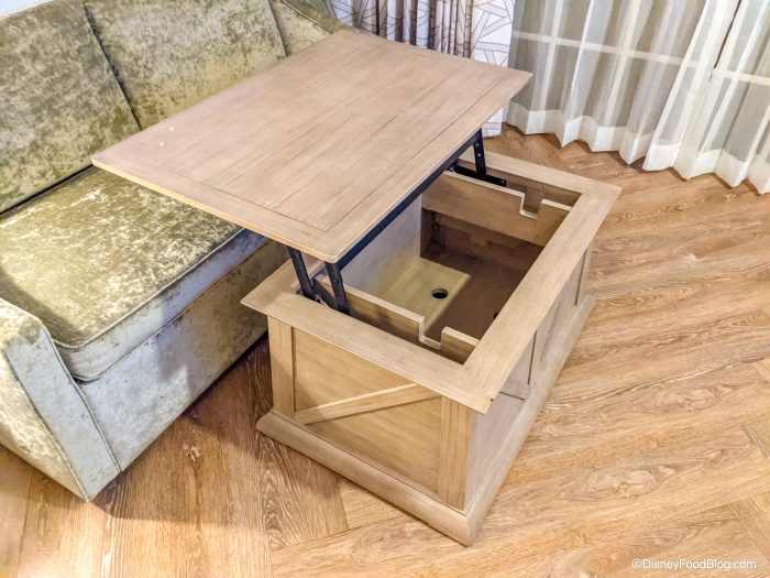 The coffee table actually has a raisable tabletop, allowing you to use the couch as a potential dining spot, perfect for those late-night caramel apples.