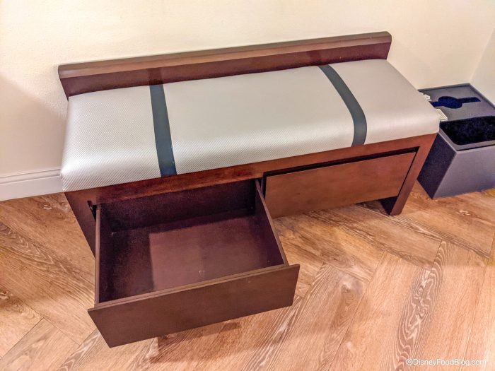 If you’re looking for even more storage, the tuffet next to the dresser has two additional drawers of storage.