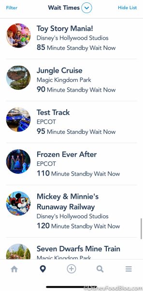 Really popular rides like Test Track and Frozen Ever After were closer to 90 or 100 minutes.