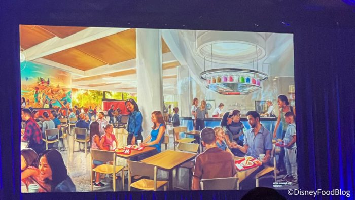 Big news! There’s a new quick service restaurant coming to EPCOT’s World Celebration neighborhood called Connections Cafe and Eatery. Disney shared concept art of what looks like a really bright and colorful space!