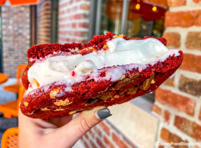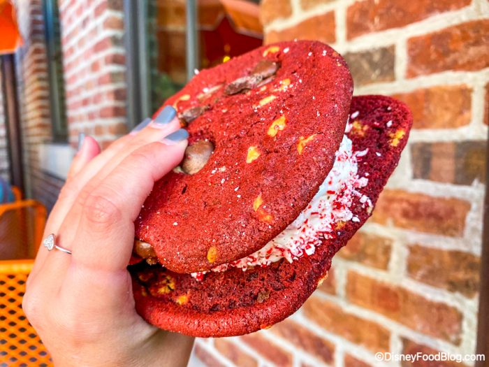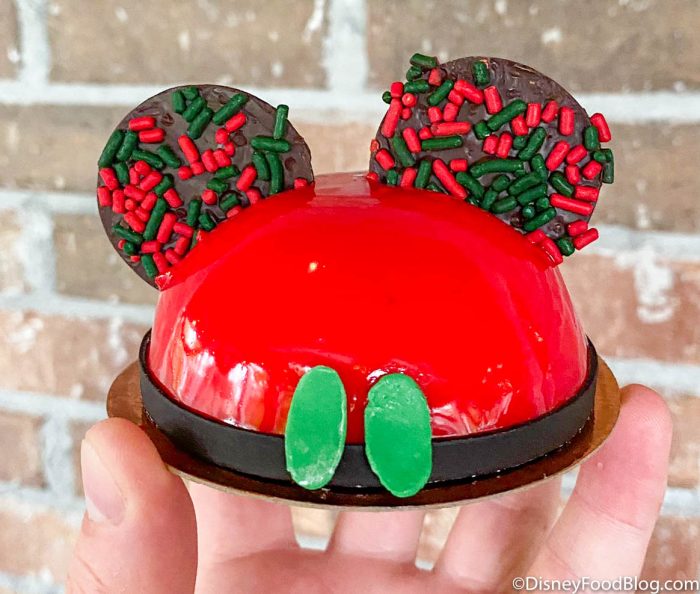 Overall, the cookies were way too hard — we wanted more of an ooey gooey consistency instead of being scared for the safety of our teeth. If you like peppermint, then you’ll probably like this, as that’s the main flavor of the sandwich. But, if you don’t want to get messy, maybe get something you can eat a little bit easier, like the Holiday Mickey Mousse Dome Cake over at Amorette’s Patisserie!