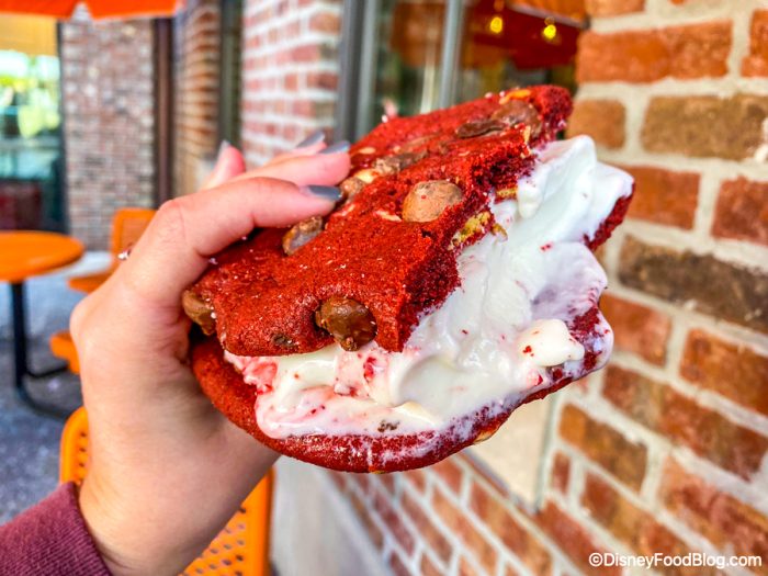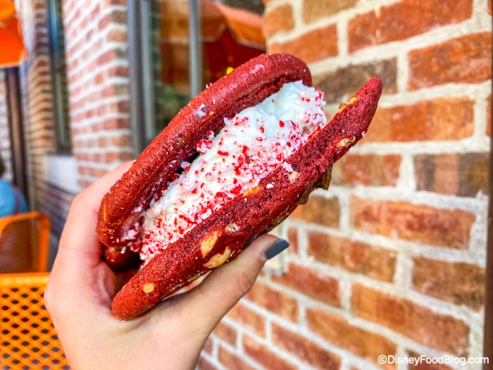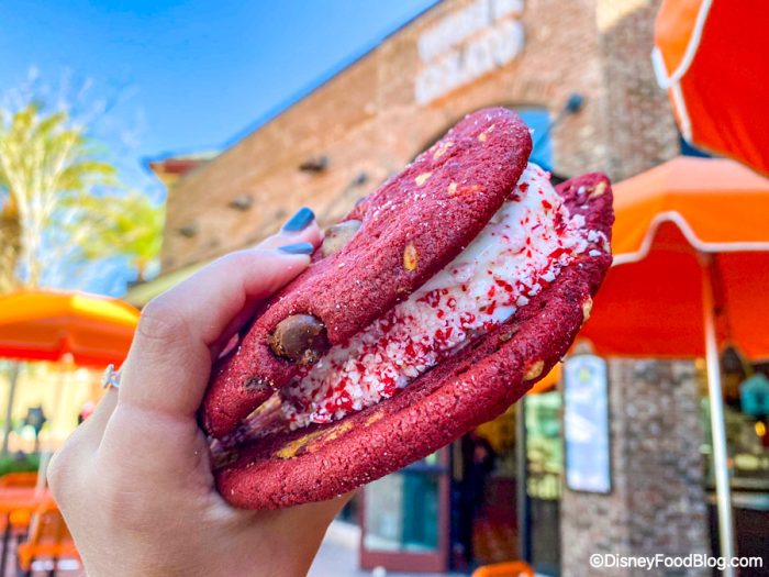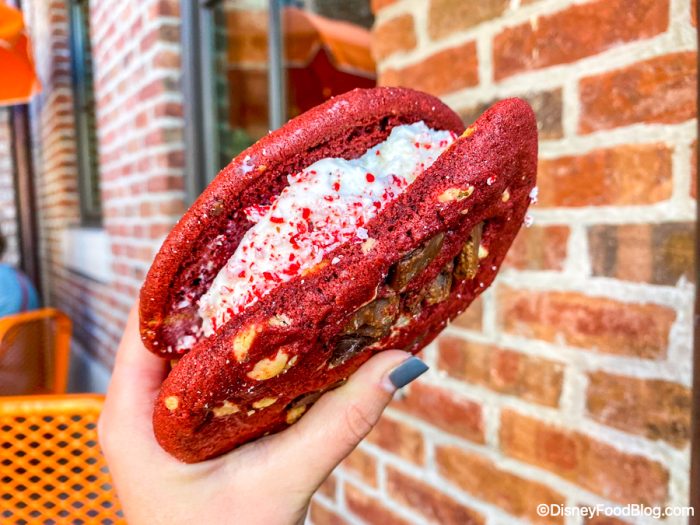This is the Peppermint Cheesecake Cookie Sandwich from Vivoli il Gelato! It has two red velvet cookies, cheesecake gelato, and peppermint candies for $12.