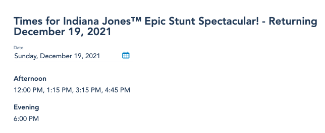 On Disney World’s website, the Indiana Jones Epic Stunt Spectacular now has showtimes up starting on the day of its return.