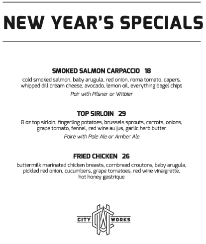 The specials include Smoked Salmon Carpaccio for $18, made with cold smoked salmon, baby arugula, red onion, whipped dill cream cheese, avocado, lemon oil, and everything bagel chips.