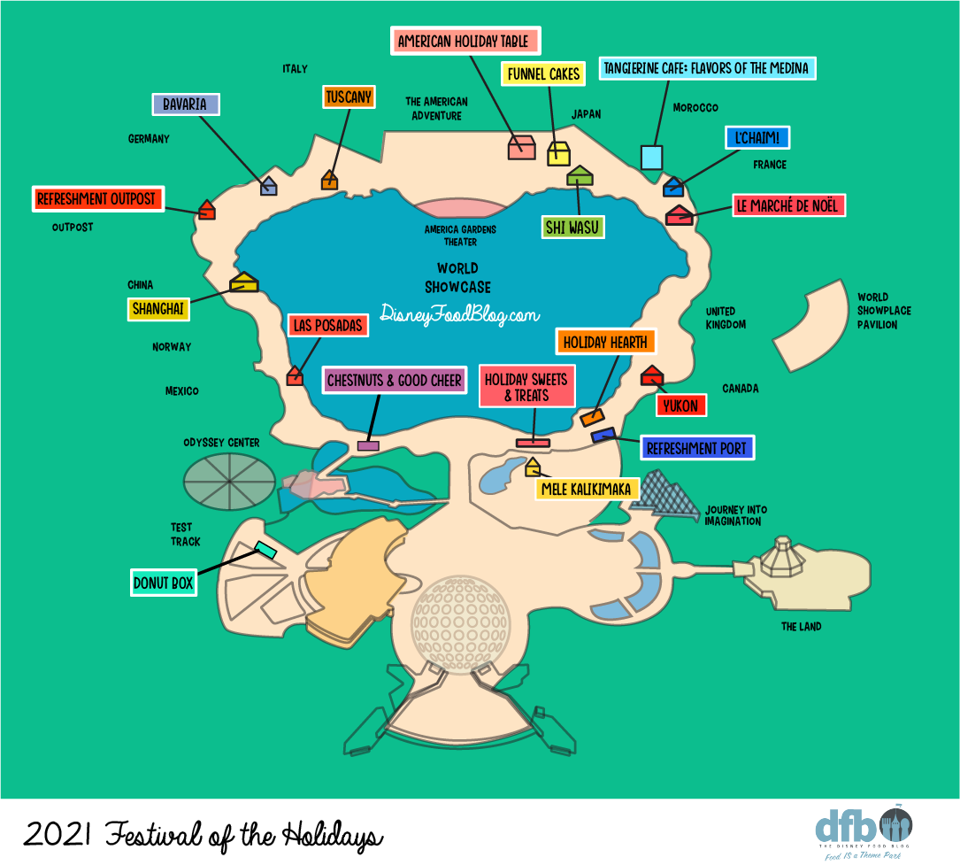 Check out this year’s DFB Festival of the Holidays Map! The map helps you locate each of the holiday kitchens around World Showcase (and the few that are located outside of World Showcase, like The Donut Box).