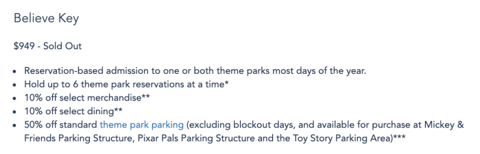 Just last month, the top-tiered pass — the Dream Key Pass — completely sold out, leaving guests with only three levels to choose from. But, now that is even more limited as the second-highest tier — the Believe Key Pass — has sold out as well.