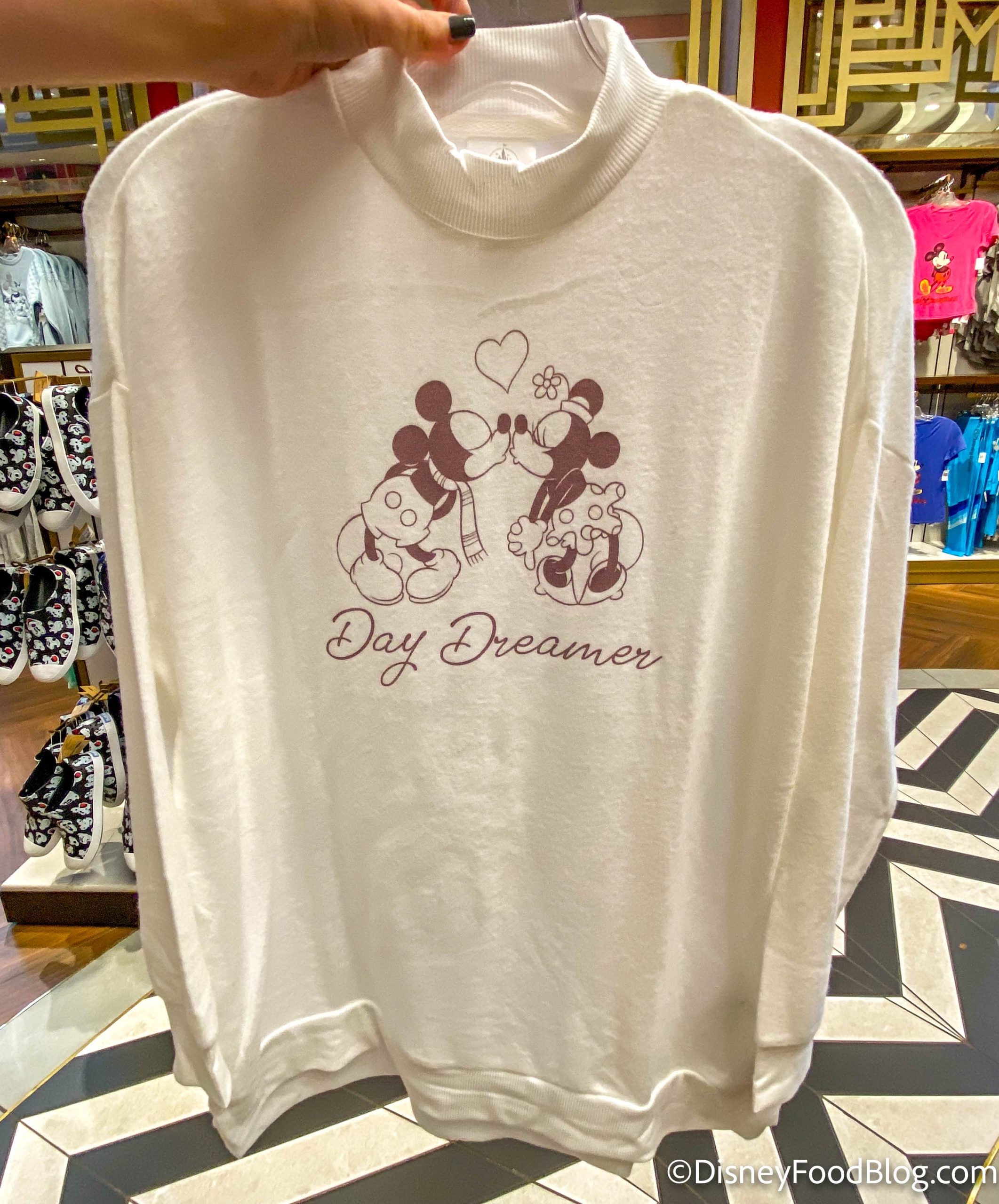 There’s also a new white Long-sleeve Turtleneck for $39.99. It says “Day Dreamer” with Mickey and Minnie sharing a smooch.