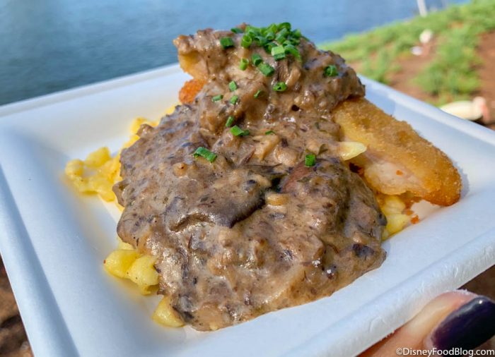 Honestly, we weren’t wowed by the presentation of many of the eats at this fest, but we DID find a returning eat that’s pretty eye-catching. The Salted Caramel Spaceship Earth Cookie can be found at Holiday Hearth Desserts for $5.50.