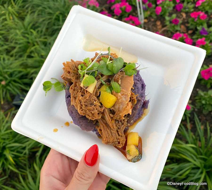 Over at Mele Kalikimaka, a booth themed to a Hawaiian Christmas, you can find the Kālua Pork with Okinawa Purple Sweet Potatoes and Mango Salad for $5.25.