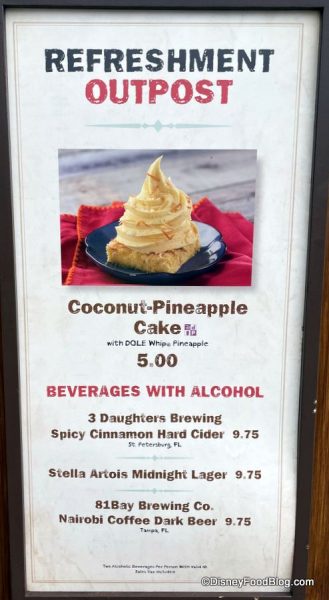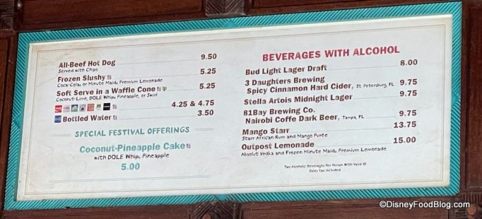 There are a few drinks on the Refreshment Outpost menu. You can order Midnight Lager, Spicy Cinnamon Hard Cider, or Nairobi Coffee Dark Beer (or try both!). Each of the drinks is $9.75.