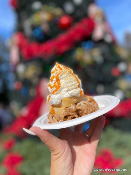 We’ve been making our way through the DELICIOUS items at the food booths, keeping an eye out for little Olafs, and are super excited for the return of Candlelight Processional. Right now, we’re tackling one of the NEW items at the Festival and it is truly the fried holiday dessert we never knew we needed.