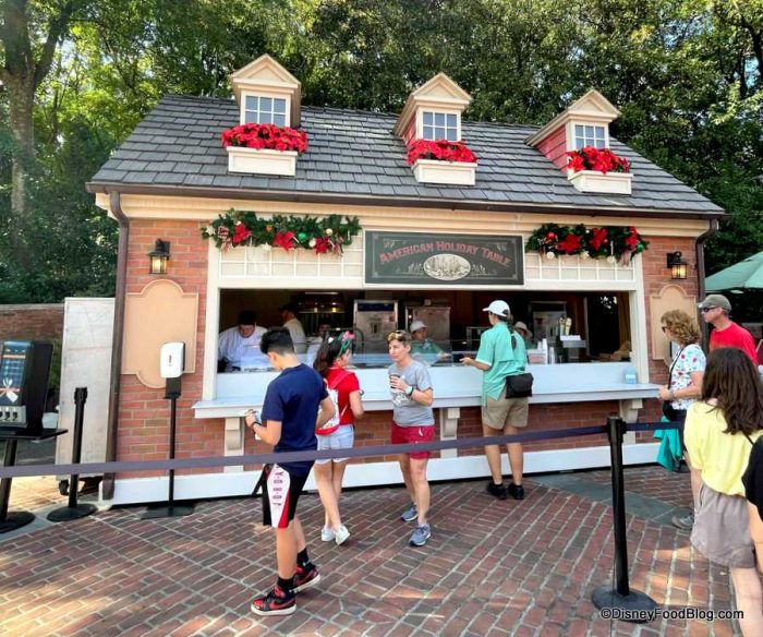 We’re trying treats from all of the festival booths in the World Showcase, and now it’s time to visit the booth in the American Adventure Pavilion. This spot is known for more traditional holiday-themed foods, but is this booth worth a try? Let’s find out!