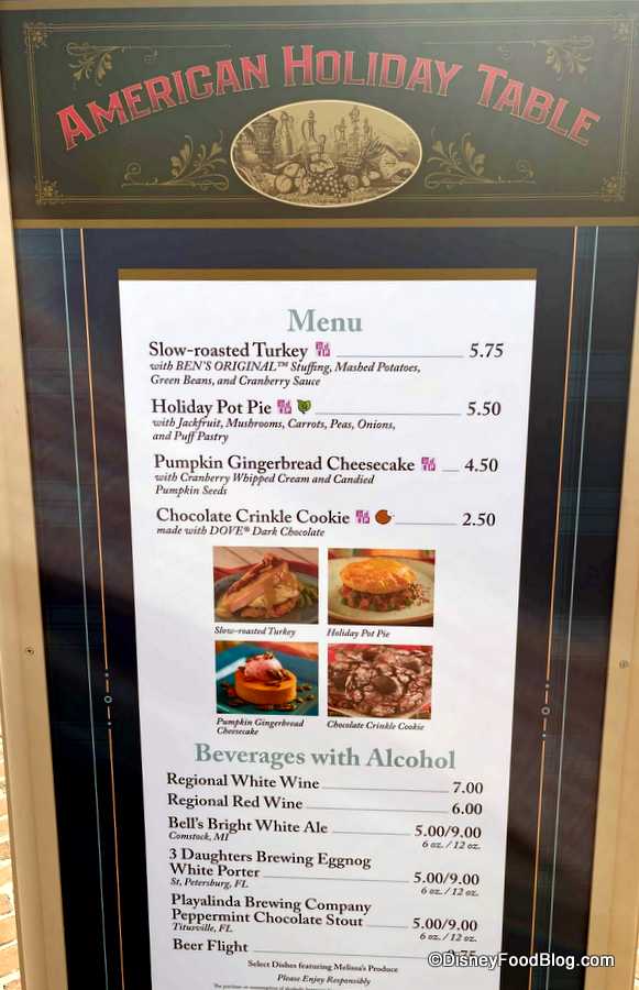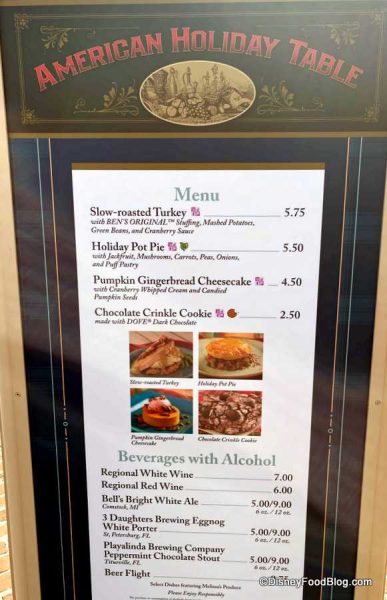 If you’re a holiday purist who appreciates the classics like gingerbread, turkey, and stuffing, you might want to visit the American Holiday Table booth during EPCOT’s Festival of the Holidays! You can find this booth in The American Adventure Pavilion.