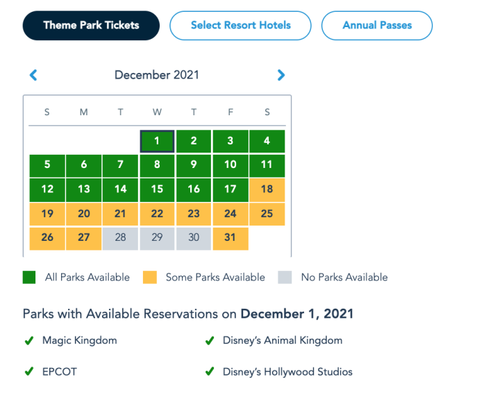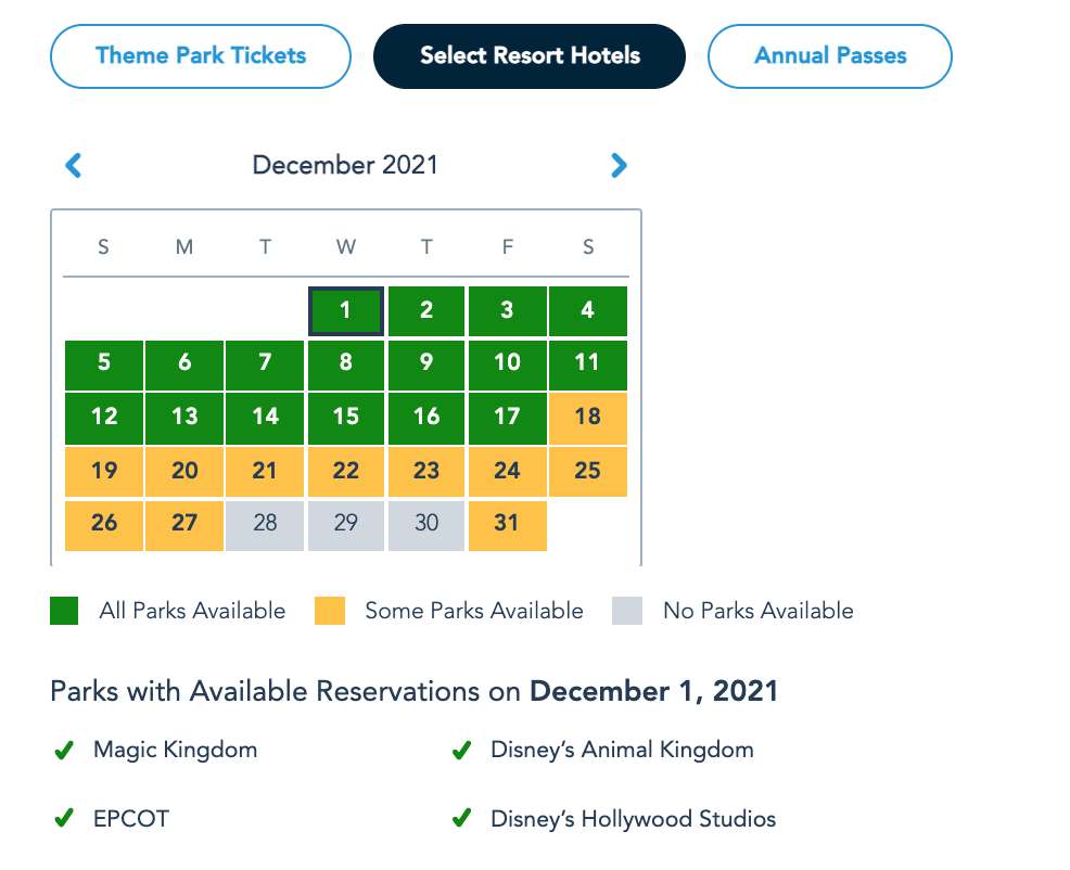 Park Pass Reservation availability for guests staying at Select Resort Hotels December 1st as of November 24th © Disney