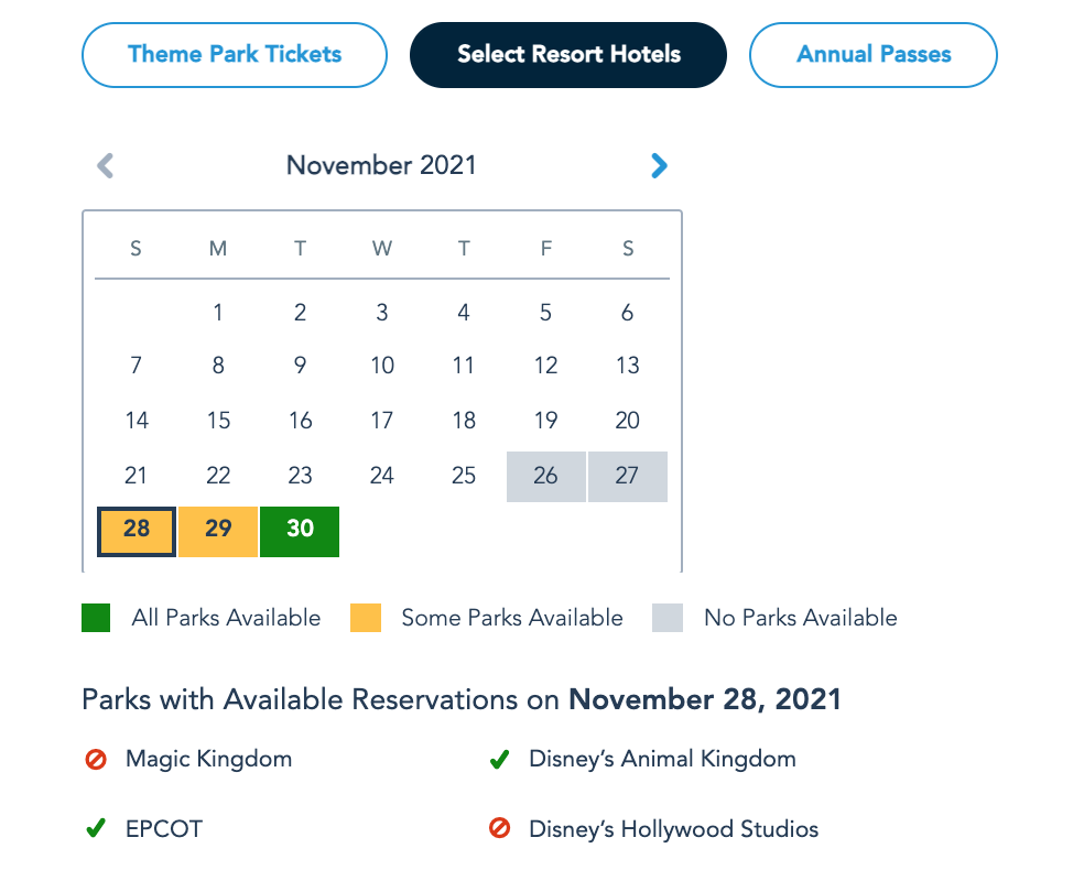 Park Pass Reservation availability for guests staying at Select Resort Hotels on November 28th as of November 26th © Disney