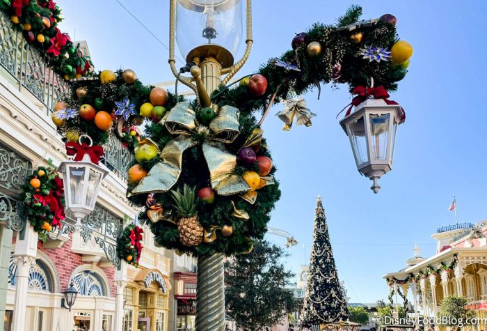 Should we start with Magic Kingdom? This year’s holiday decorations feature a lot of pineapples, like this gorgeous wreath with Cinderella Castle in the background.