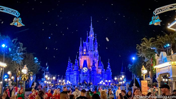 During Disney Very Merriest After Hours party in Magic Kingdom, Main Street, U.S.A. was filled with snoap (aka fake snow) as Cinderella Castle sparkled in the background. It’s probably the only way we’ll ever see snow in Disney World.