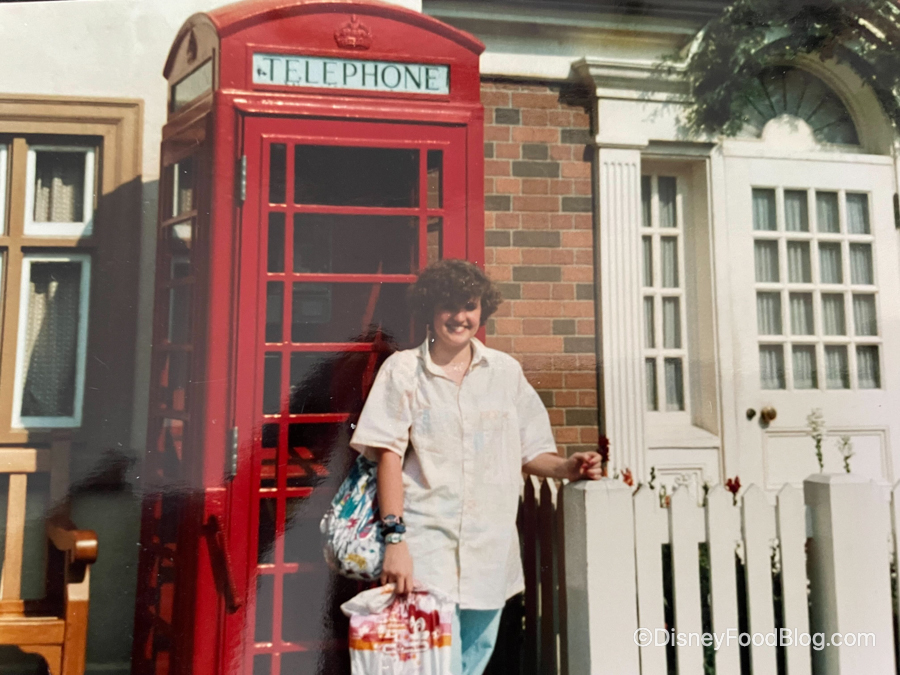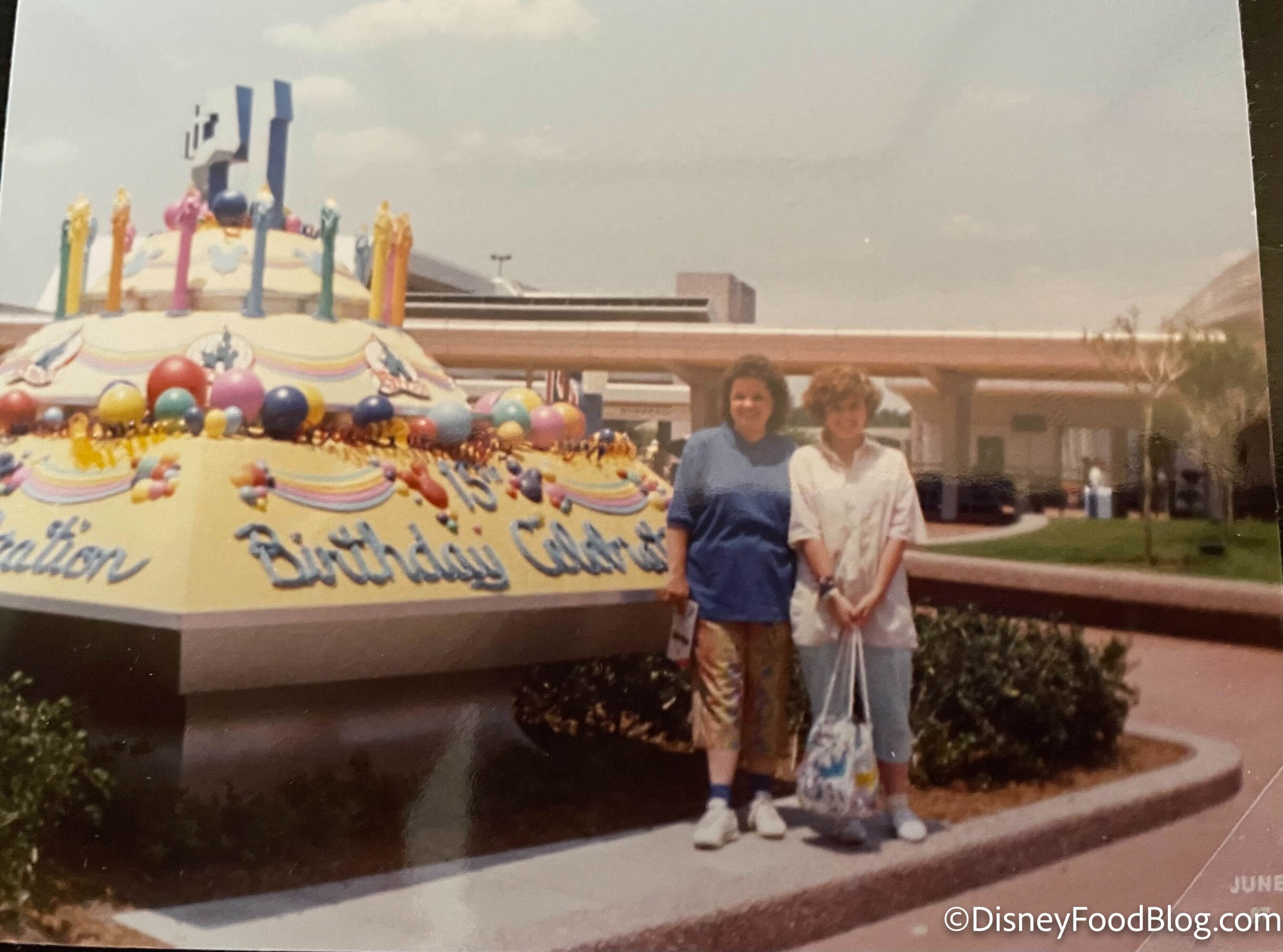 Now, let’s discuss throwback pics in general. Here’s one from Disney World’s 15th Anniversary, when they had a giant (square?) birthday cake by the EPCOT entrance plaza. We have nothing to say except that it was the 80s…all of our photos were awkward back then.