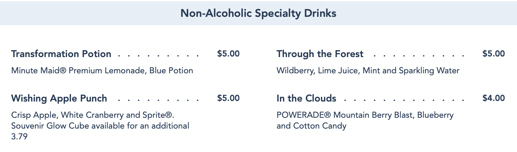 The kids’ menu has not changed, but the drink menus have had a few updates! The non-alcoholic Wishing Apple Punch has dropped in price from $7 to $5, but it will no longer include a Souvenir Glow Cube. Now, the Glow Cube may be purchased for an additional $3.79.