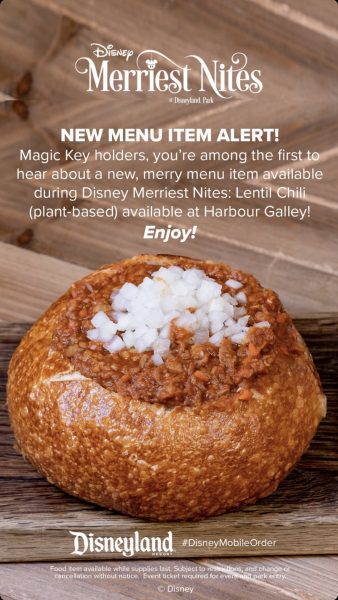 Over at Harbour Galley, guests can now order a plant-based Lentil Chili! Disney first made the announcement to current Magic Key Holders, but the item will be available to all guests attending Merriest Nites. Those evenings can get a little chilly in Disneyland, so this chili sounds like it’s the perfect dish to warm you up!