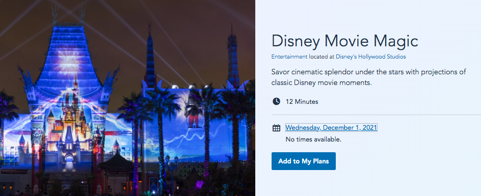 As of this writing, there are no December times being shown for the nighttime entertainment in Hollywood Studios. This includes Disney Movie Magic, which usually happens every night at 8:40PM…