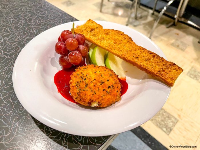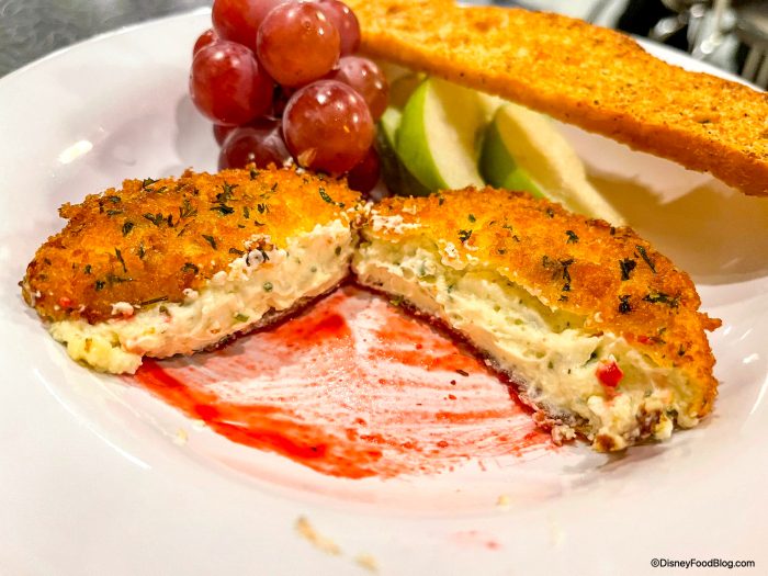 Get those stomachs and taste buds ready folks: the Fried Herb and Garlic Cheese is back! This treat is exactly what it sounds like: it’s a piece of breaded and fried cheese with garlic and herb flavors, which is served with Grapes, Apple Slices, a Crostini, and Raspberry Sauce.