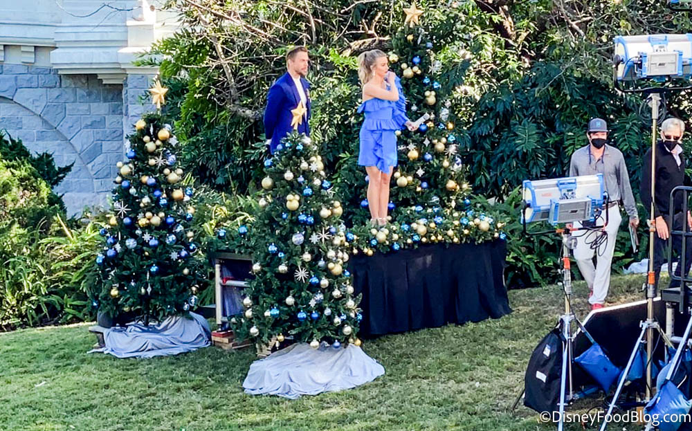 While we were walking by Cinderella Castle in Magic Kingdom, we noticed a setup for filming nearby. There were lights and cameras, as well as a stage decorated for the holidays.