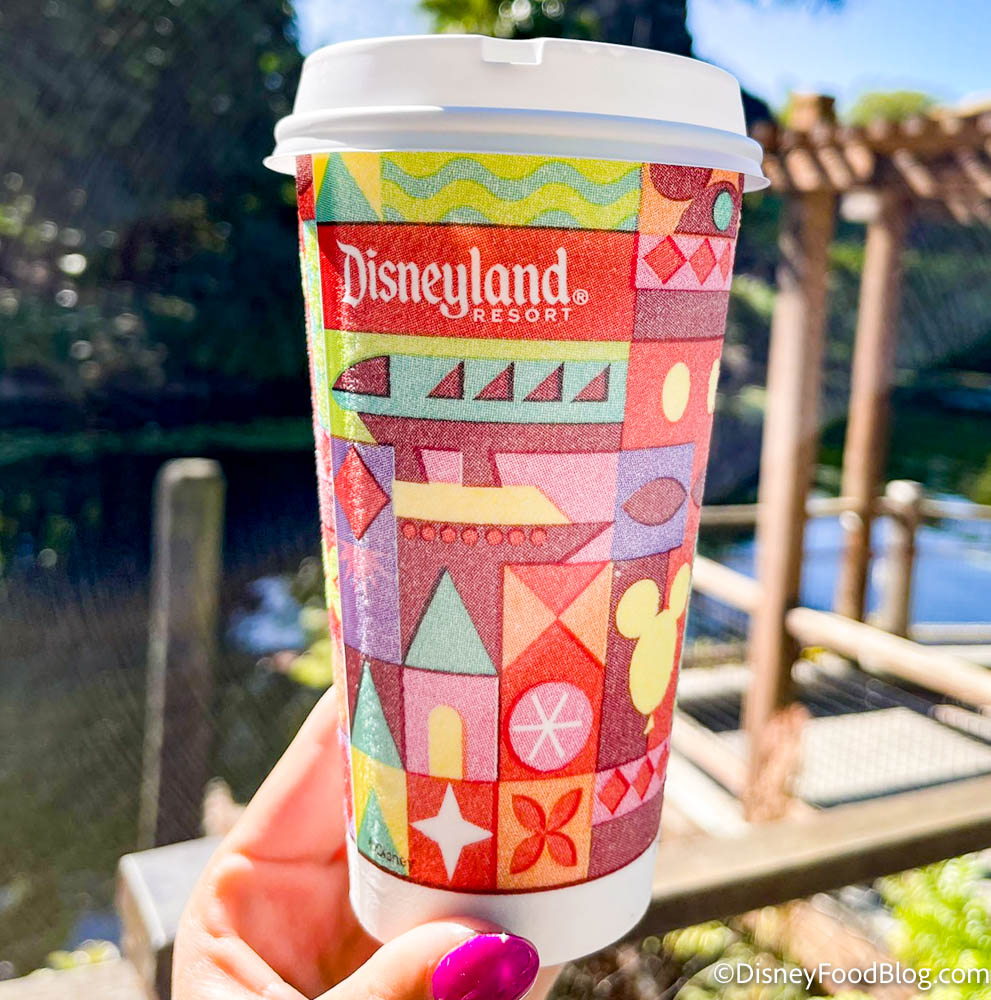 So we REALLY weren’t expecting another surprise in the same visit! But when we ordered a coffee to go on our way out, that’s just what we got. Here’s a look at our coffee — isn’t the cup pretty? It has Mary Blair-inspired designs, like the ones you’ll see on “it’s a small world.” But that’s not all it has… .