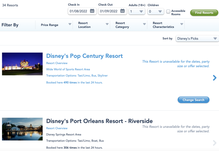 While we were able to see stays for only one night in Disney World, there are a few dates that were unavailable for us to book, like January 8th and 9th.