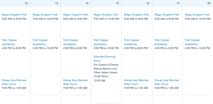 Magic Kingdom will be open from 8AM-8PM Sunday (12th), Tuesday (14th), Thursday (16th), and Friday (17th) — the same nights as Disney Very Merriest After Hours, which will take place on those days from 9PM-1AM. Magic Kingdom will be open from 9AM-10PM Monday (13th), Wednesday (15th), and Saturday (18th).