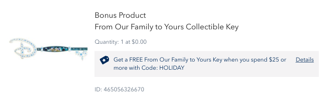 Starting today, while supplies last, you can pick up a FREE From Our Family to Yours collectible key with all purchases of $25 or more on shopDisney.