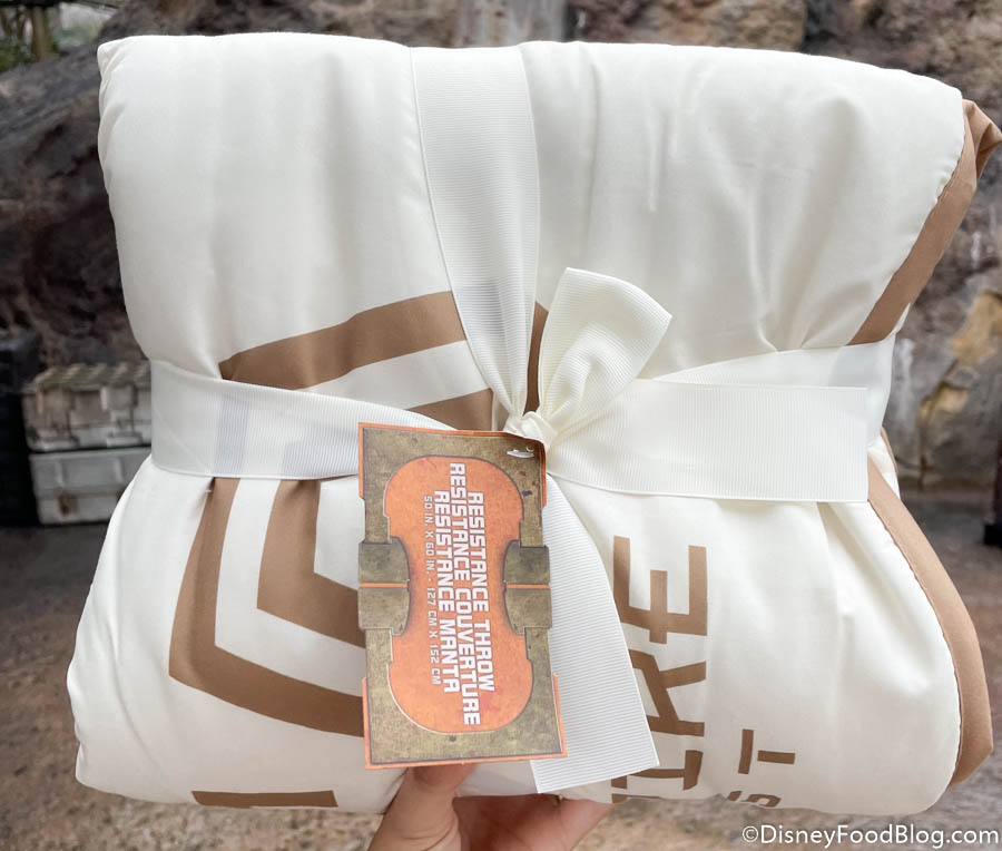 One of the carts near Rise of the Resistance in Star Wars: Galaxy’s Edge had a Black Spire Outpost White Throw Blanket for $59.99. Cozy!