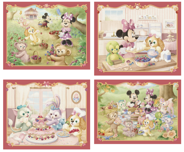 The café also features four murals showing Mickey, Minnie, Duffy, CookieAnn, and friends gathering berries, baking a cake, decorating the treats, and enjoying a picnic!