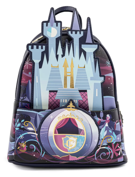 If you’re a Castle person, the Cinderella Castle Loungefly Mini Backpack is faux leather with some incredible 3D details, including a 3D applique of Cinderella Castle and Cinderella’s Coach. On the back of the backpack is artwork of Cinderella’s transformation from rags to riches!