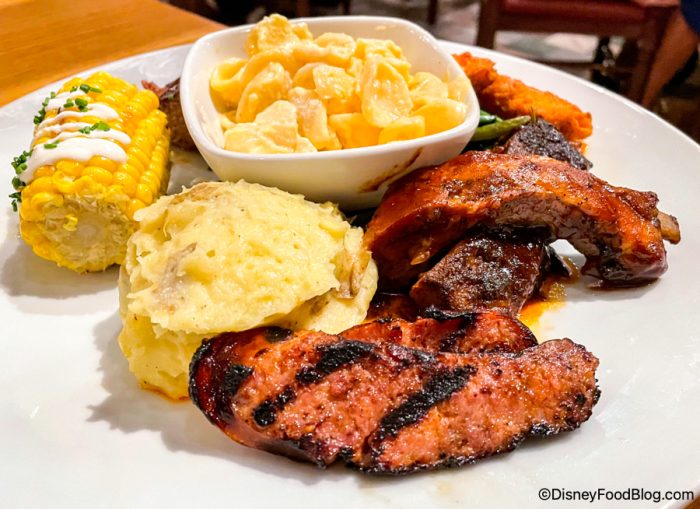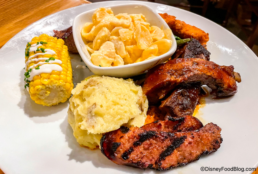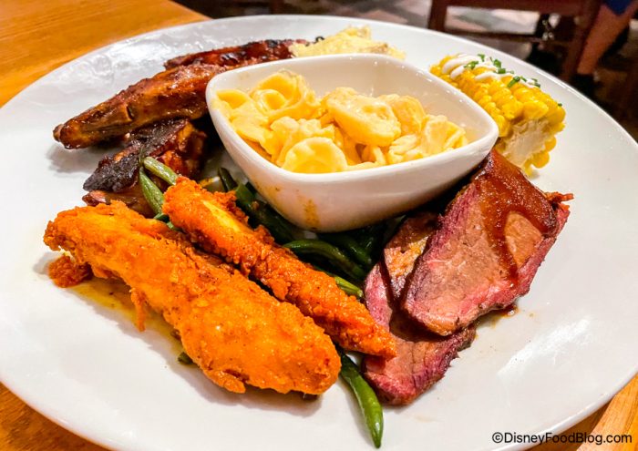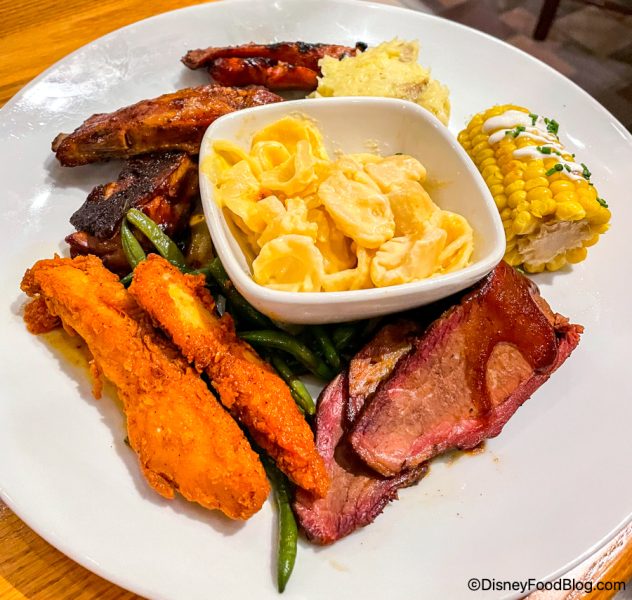 The macaroni and cheese is homemade and has thick noodles, but the sauce was lacking for us. It’s missing that overall cheesy flavor and those awesome cheese pulls a lot of mac and cheeses have. But, it was a good break from the other foods on the plate because it’s a way milder flavor.