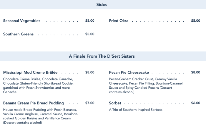 Sides include seasonal vegetables, southern greens, and fried okra. The dessert menu just screams the word “decadent” with options like Mississippi Mud Crème Brûlée, Banana Cream Pie Bread Pudding, and Pecan Pie Cheesecake. Are you hungry yet?!