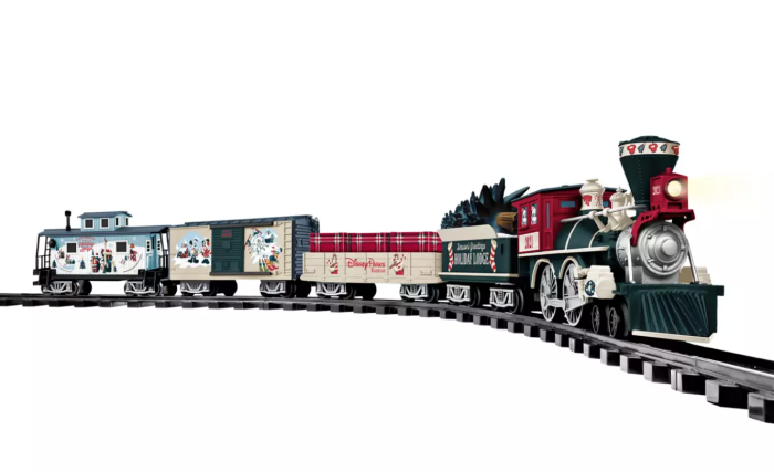 The holiday-themed train set is made by Lionel and comes with a “locomotive, four train cars with character surprises, and plenty of track!” It even has a working headlight, train sounds, and 2021 artwork.